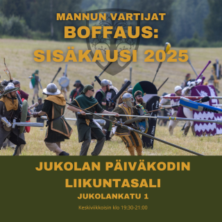 Syyskauden ajan Mannun Vartijat järjestävät boffauksen eli pehmomiekkailun sisätreenejä joka keskiviikko Jukolan päiväkodin liikuntasalilla, osoitteessa Jukolankatu 1, 80160 Joensuu. Mannun Vartijoiden sisätreenit ovat kaikille avoimia ja ilmaisia. Mukaan tarvitset nesteytystä, sisäpelikengät ja liikuntavarusteet.